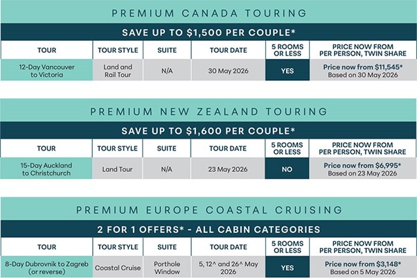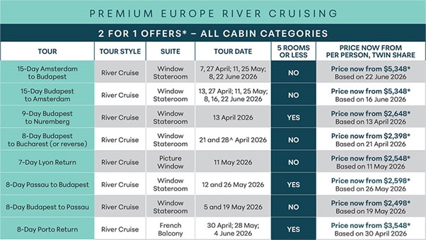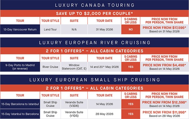 *Conditions apply. Prices are per person (pp), AUD, twin share. Prices include port charges, tipping and savings where applicable. Offers and prices are correct as at 1 april 2026, but may fluctuate if surcharges, fees, taxes or currency change. All offers are valid for bookings made by 30 April 2026, unless sold out prior. Where multiple dates are listed on a particular itinerary, the lowest lead-in price is featured – prices may vary slightly on each departure date. Available on new bookings only and subject to availability. If more than one itinerary is booked, the discount applies only to the first itinerary in the booking. A limited number of offers are valid on each departure. Some departures listed have fewer than 3 cabins/seats/rooms remaining. Offers are strictly limited and may be withdrawn at any time. For all Hot Deals, member/Loyalty Club benefits do not apply. Approximately 21 days before departure, you will receive your documents together with your final itinerary by email. Deposit Cancellation Peace of Mind cannot be purchased and does not apply to your booking. Full payment is due within 3 days of booking. No amendments to your booking will be allowed after full payment has been made. Cancellations received after full payment has been made will incur 100% cancellation fees. Offers are only available on the departure dates listed above and cannot be combined with any information session offers or market place offers. MONETARY SAVINGS: Offer cannot be redeemed for cash and is not transferable. ABN 44 004 684 619. 7086-AU.  Supplier: APT/TVL